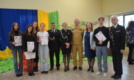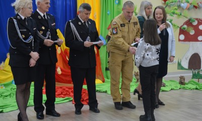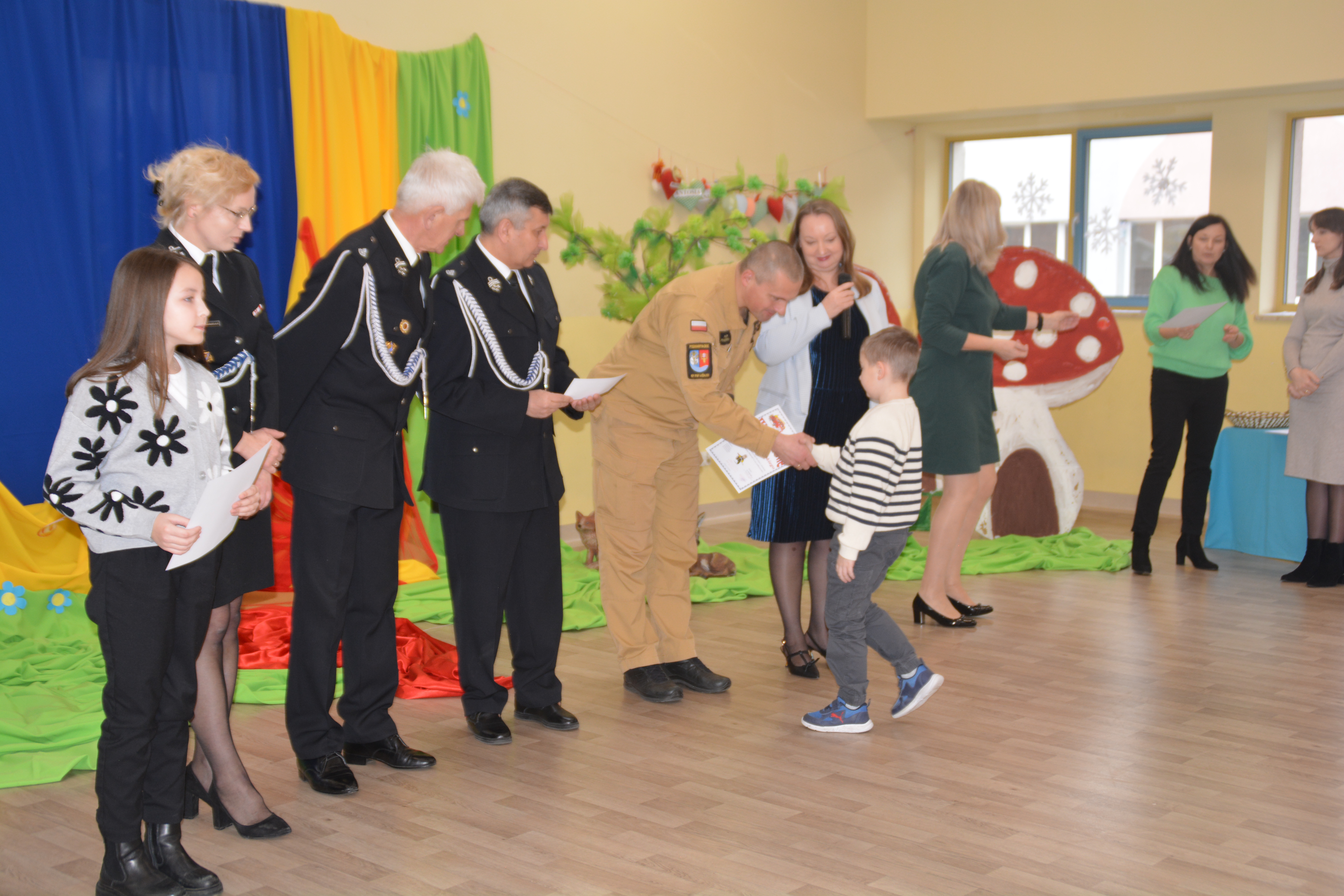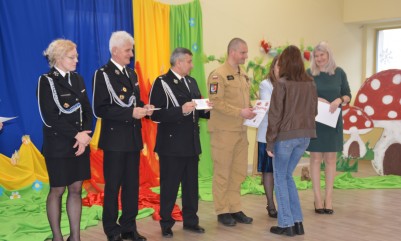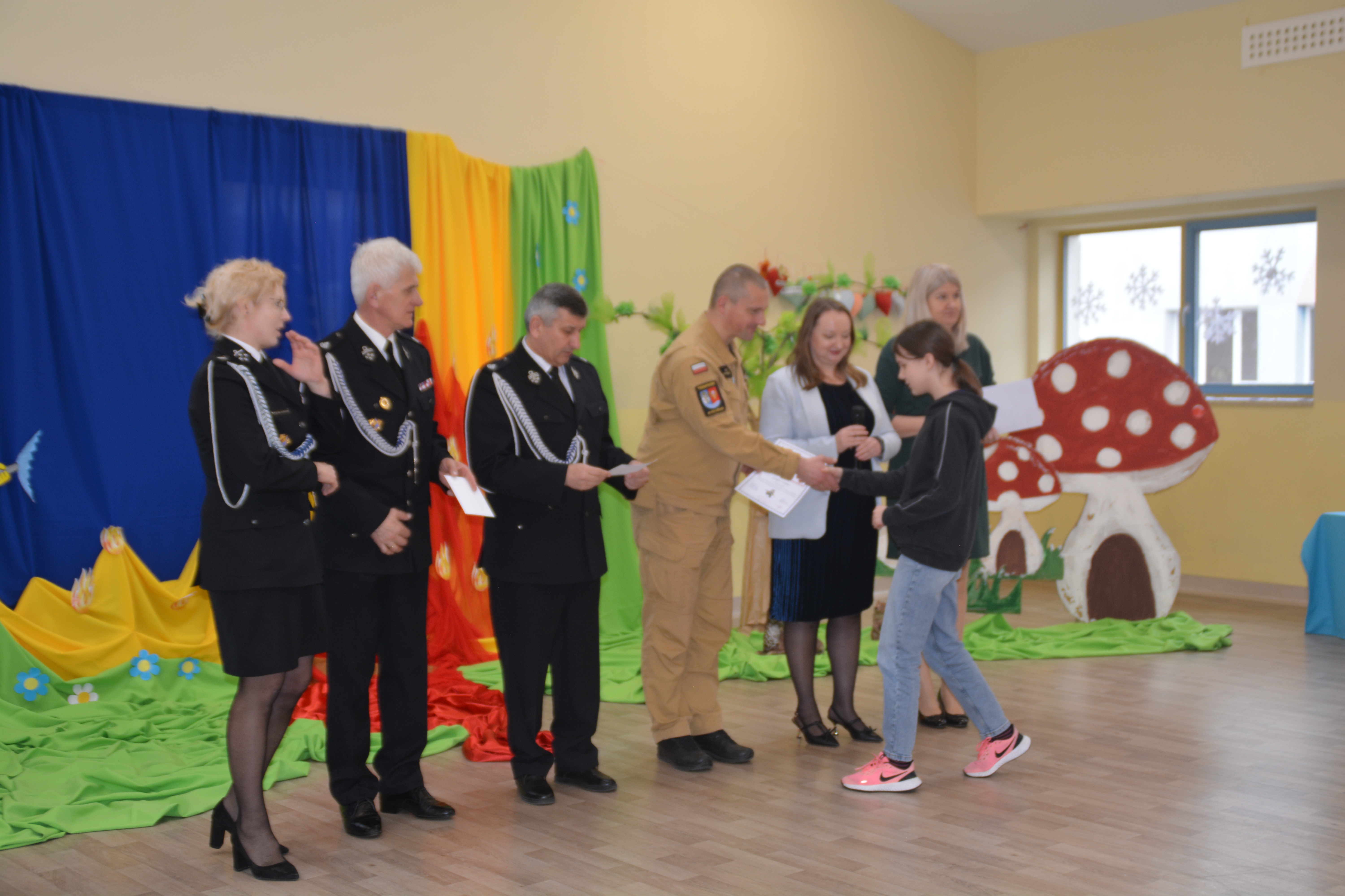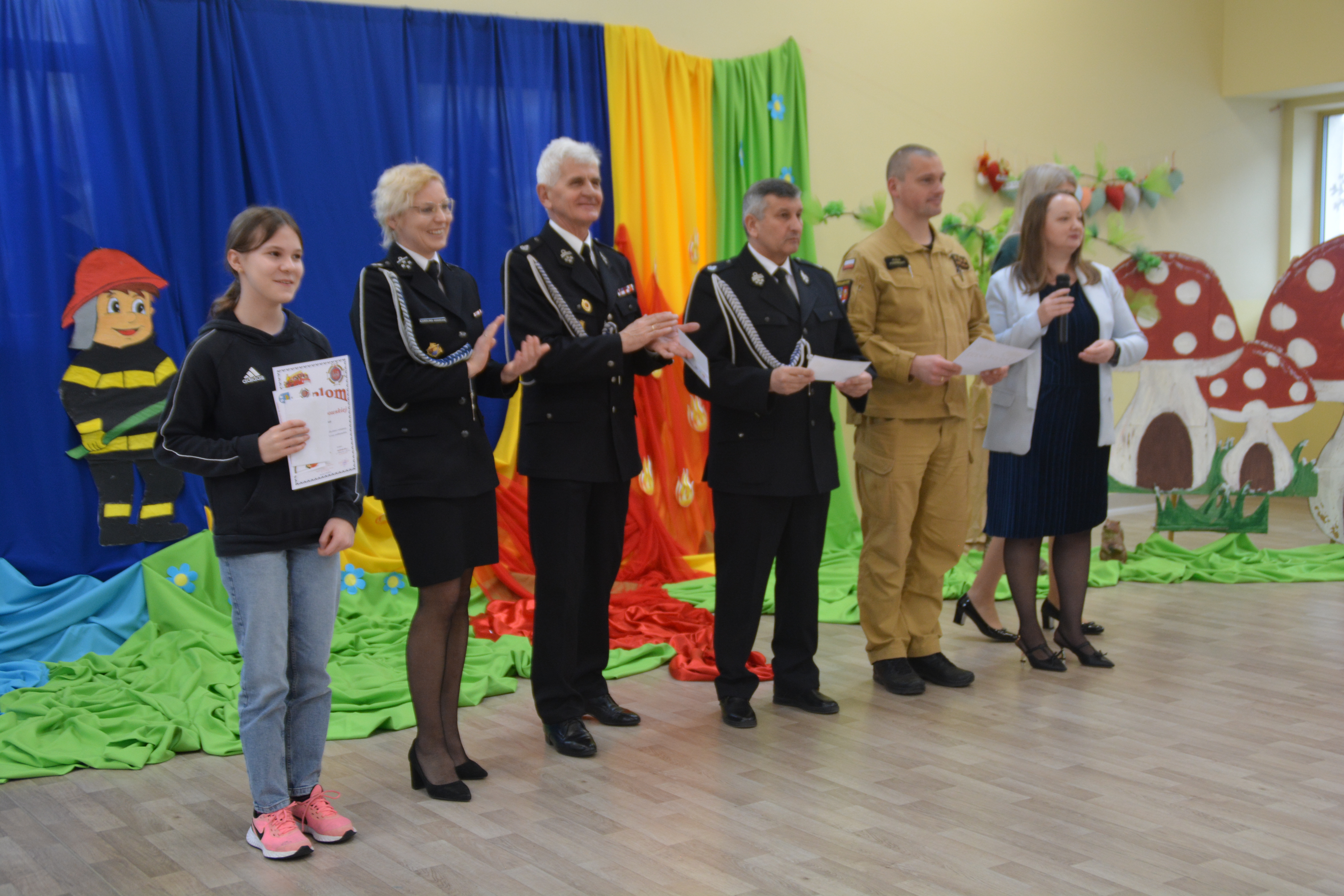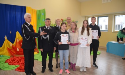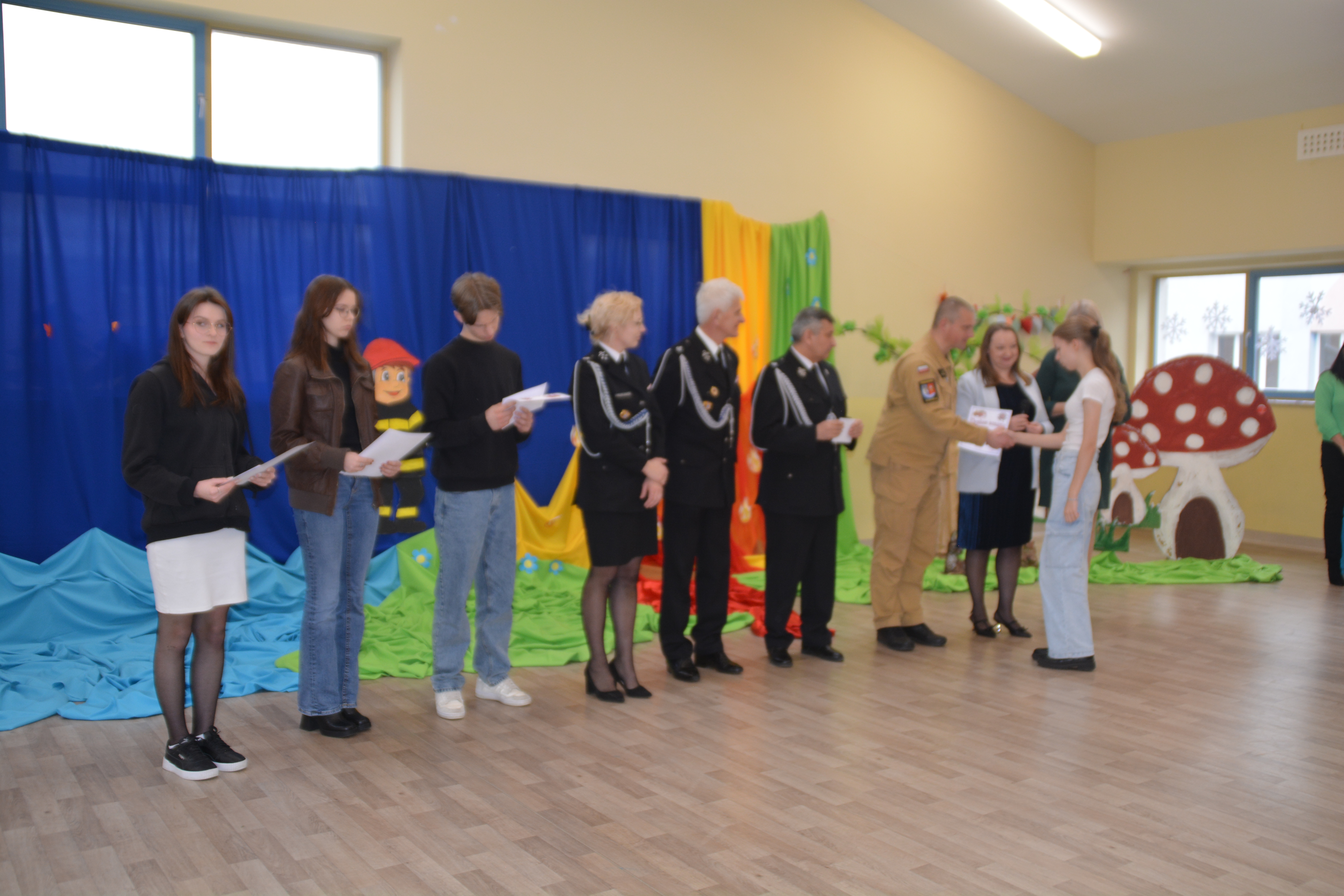 Nagrody uczniom wręczali: Dyrektor SP w Sarzynie- Pani Monika Milo, Prezes Zarządu Miejsko- Gminnego ZOSP RP w Nowej Sarzynie- dh Jan Pinderski, prezes Zarządu Oddziału Powiatowego ZOSP RP w Leżajsku- dh Jerzy Paul, dowódca JRG w Nowej Sarzynie - st. kap. Piotr Pinderski, prezes OSP Sarzyna- dh Karolina Adamiak.