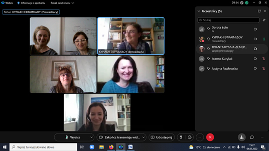 W przyjemnej, aczkolwiek profesjonalnej atmosferze, z wielką uwagą i zainteresowaniem wysłuchałyśmy, co miały do przekazania koleżanki z Grecji. Szczerze podzieliły się z nami swoimi cennymi zdobyczami w zakresie rozwijania wyżej wymienionych kompetencji językowych w zdalnym nauczaniu. To kolejne, cenne doświadczenie i kopalnia ciekawych pomysłów, które zdecydowanie wykorzystamy w przyszłości. Dzięki uprzejmości i zaangażowaniu kadry językowej z Diavaty, nasze lekcje języka angielskiego będą obfitowały w nowości i zapewne wywołają pozytywne zaskoczenie wśród naszych uczniów.
