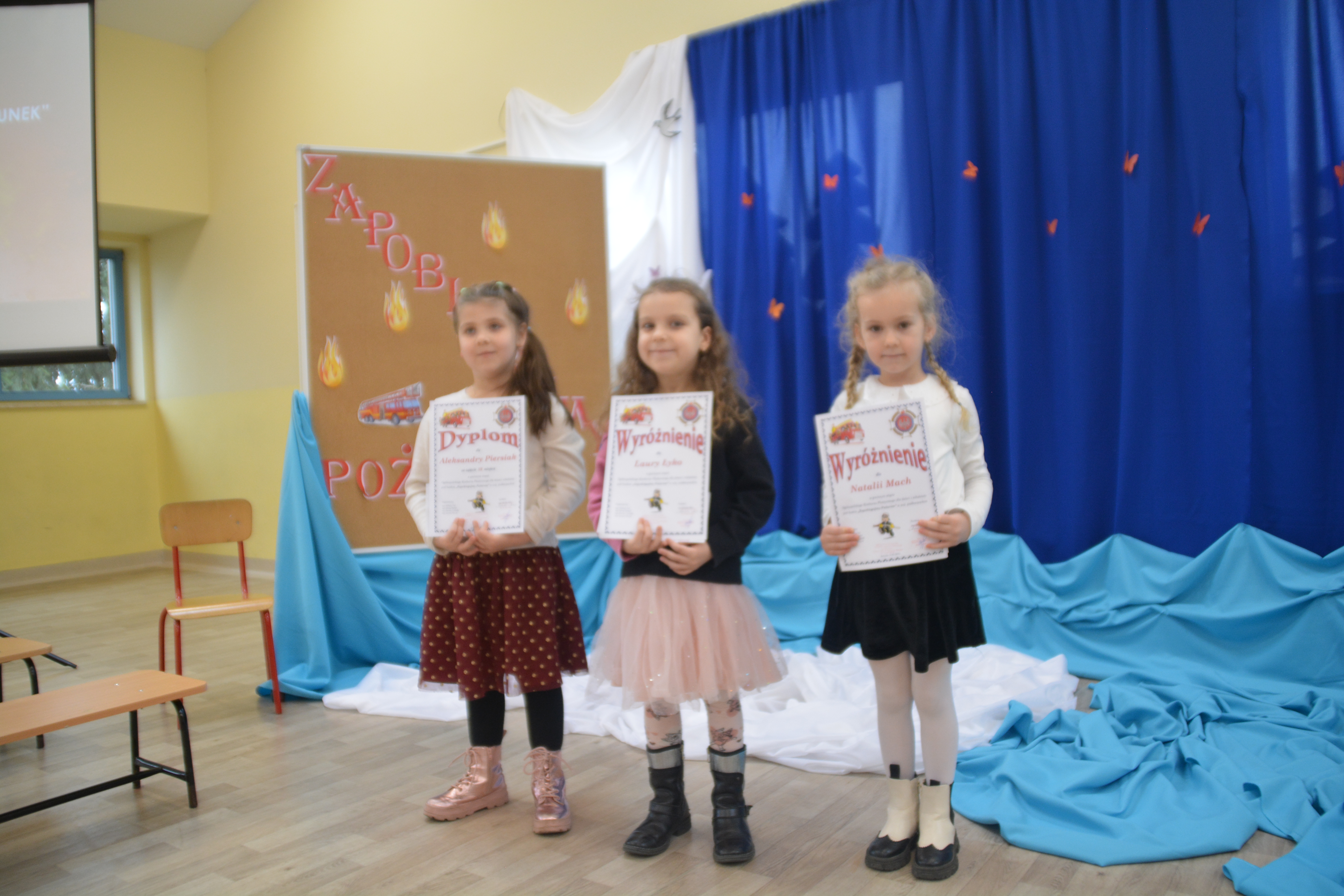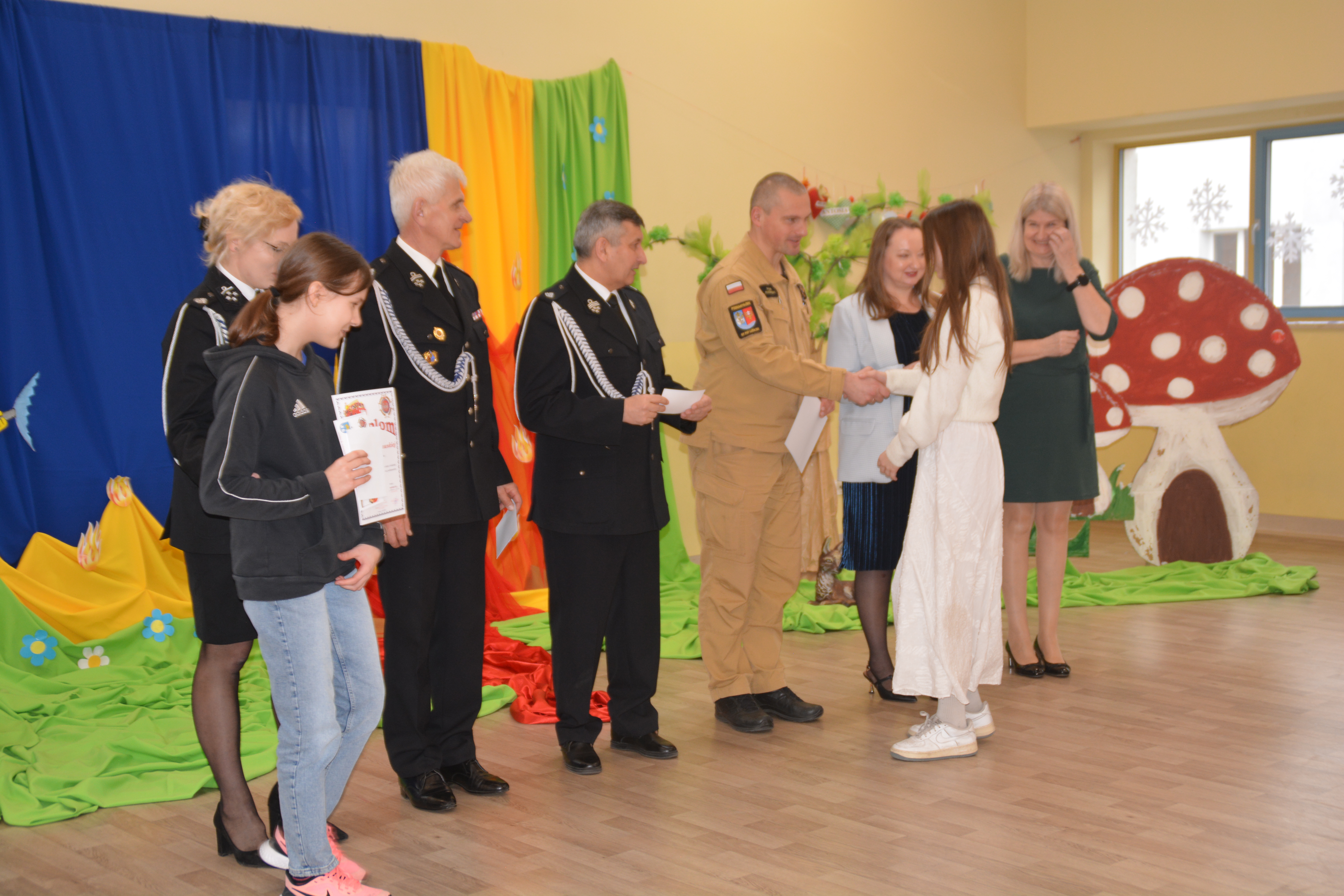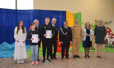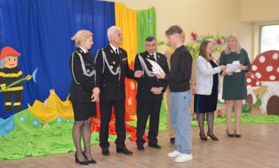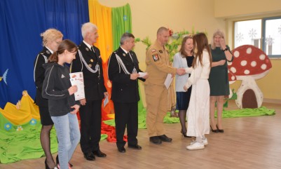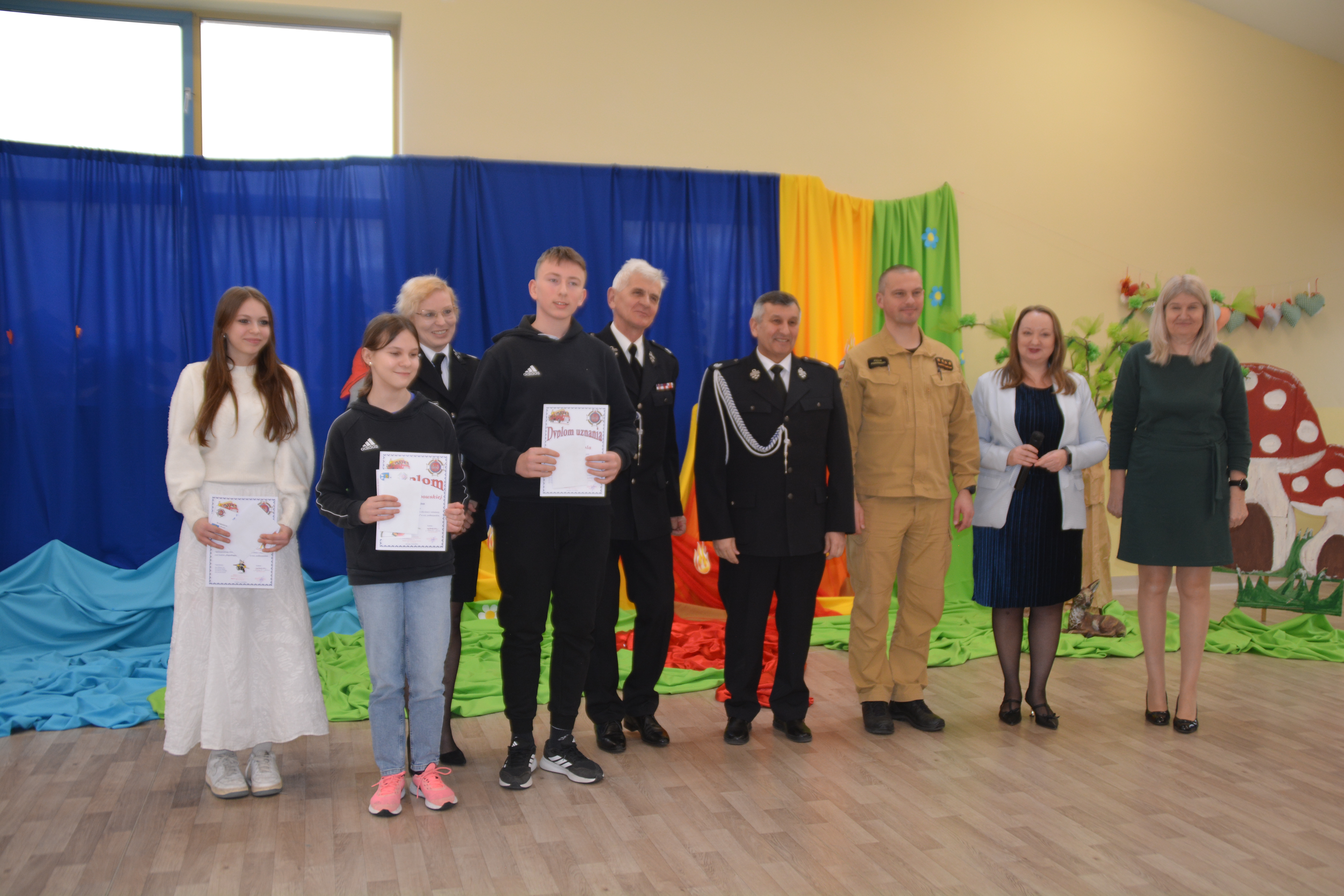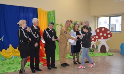Nagrody uczniom wręczali: Dyrektor SP w Sarzynie- Pani Monika Milo, Prezes Zarządu Miejsko- Gminnego ZOSP RP w Nowej Sarzynie- dh Jan Pinderski, prezes Zarządu Oddziału Powiatowego ZOSP RP w Leżajsku- dh Jerzy Paul, dowódca JRG w Nowej Sarzynie - st. kap. Piotr Pinderski, prezes OSP Sarzyna- dh Karolina Adamiak.