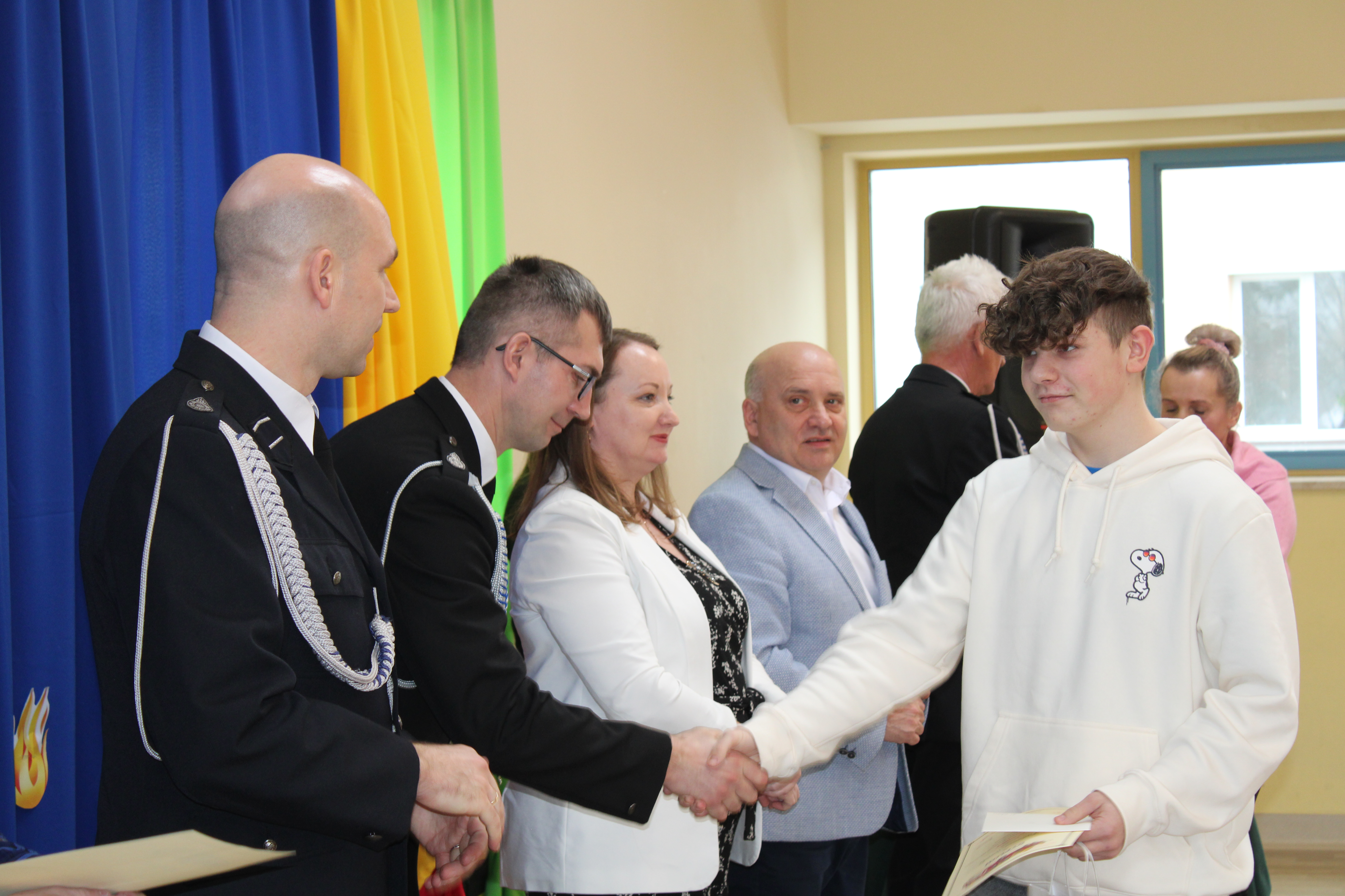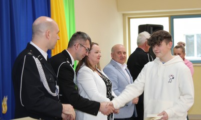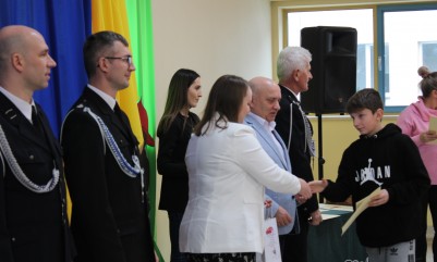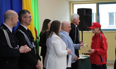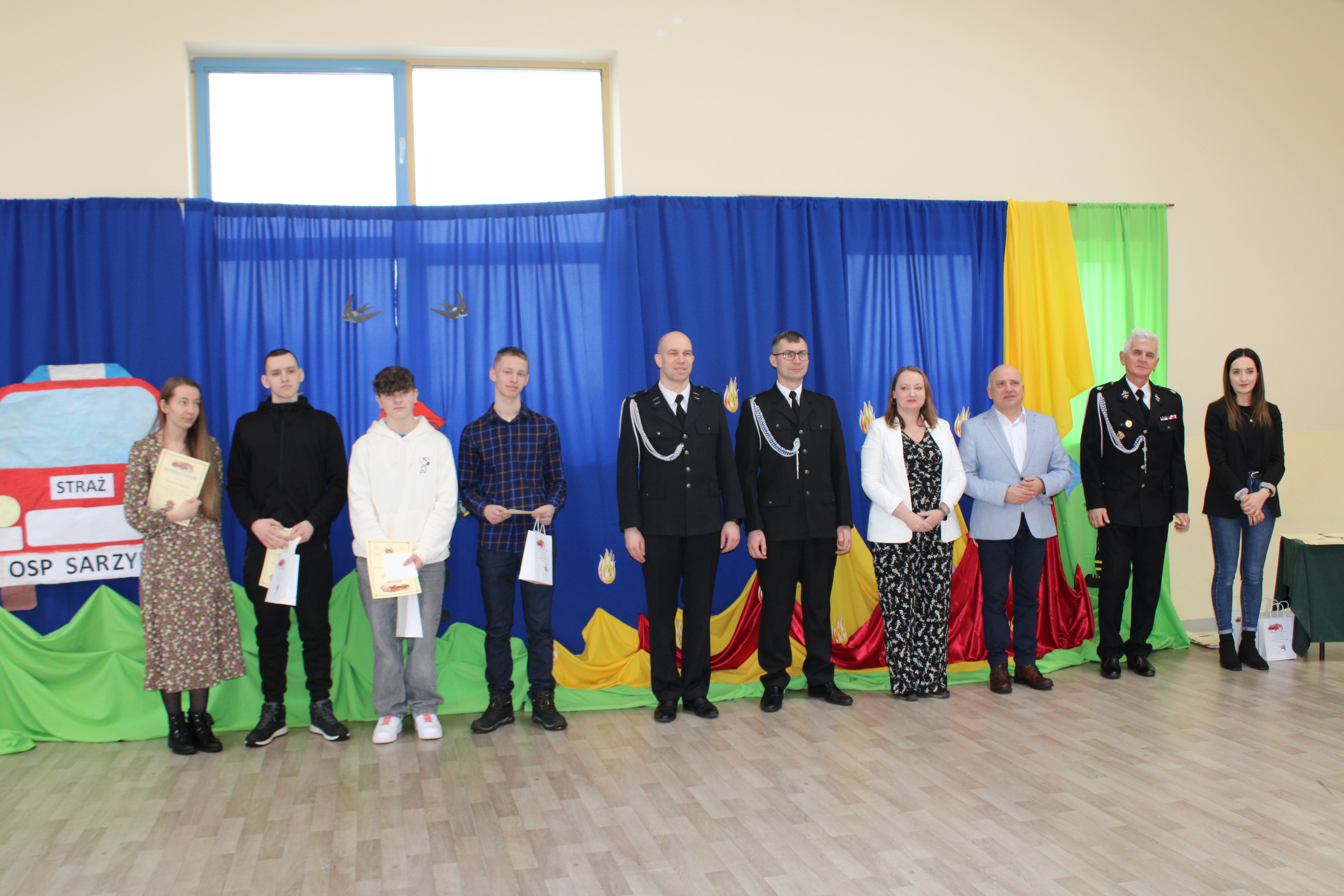 Nagrody wręczali uczniom: Burmistrz Miasta i Gminy Nowa Sarzyna- Pan Andrzej Rychel, dyrektor SP w Sarzynie- Pani Monika Milo, Prezes Zarządu Miejsko- Gminnego OSP RP- dh Jan Pinderski oraz druhowie z OSP Sarzyna - Krzysztof Trestka i Damian Żuczek.