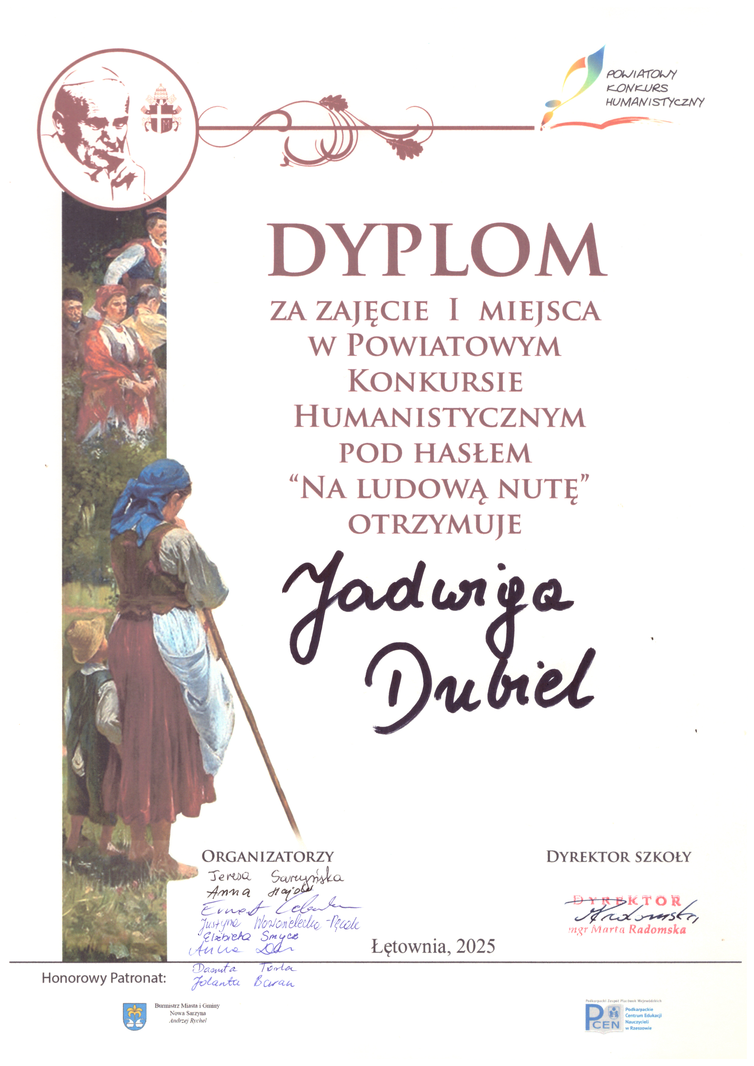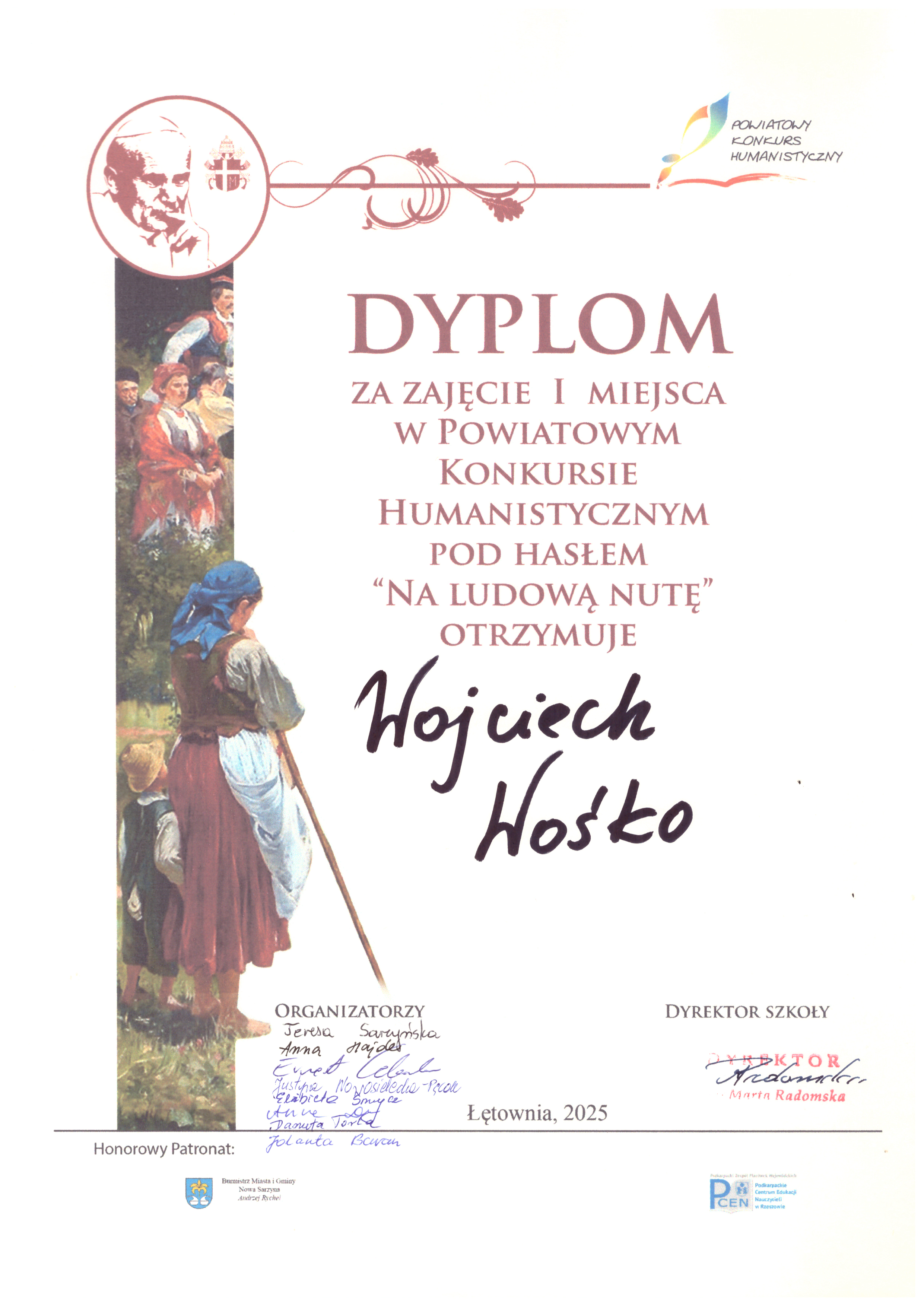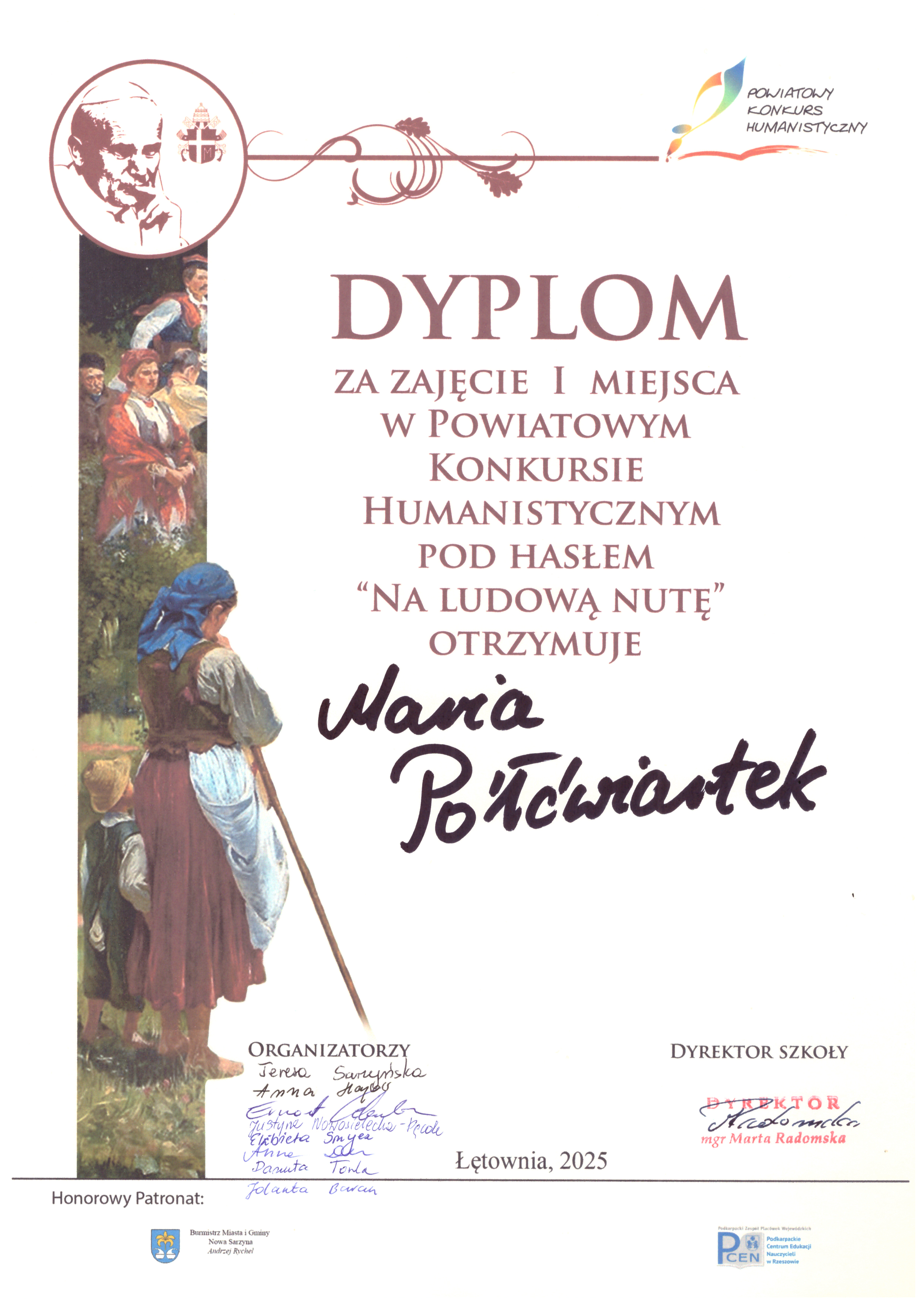 W dniu 19.11.2025 r. w Filii Centrum Kultury i Biblioteki w Łętowni odbył się V Powiatowy Konkurs Humanistyczny pod hasłem „Na ludową nutę”, którego celem było przybliżenie uczniom bogactwa polskiej kultury ludowej oraz rozwijanie wśród nich zainteresowań literackich, muzycznych, plastycznych i historycznych. Organizatorem drużynowych zmagań konkursowych była Szkoła Podstawowa im. św. Jana Pawła II w Łętowni. Konkurs został objęty honorowym patronatem Podkarpackiego Centrum Edukacji Nauczycieli w Rzeszowie oraz Burmistrza Miasta i Gminy Nowa Sarzyna.